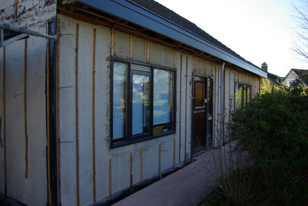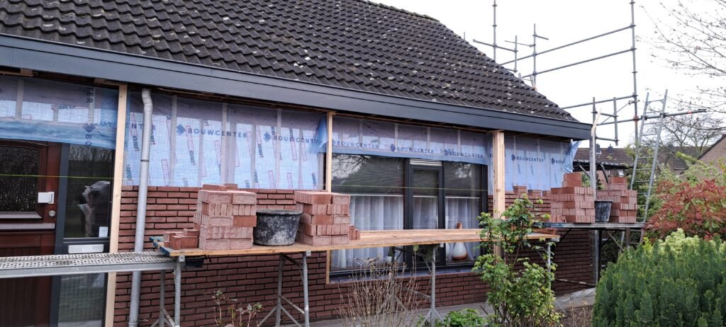 Opbouwen van de nieuwe gevel, na het plaatsen van PIR-isolatieplaten en het vernieuwen van de dakgoot.